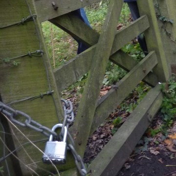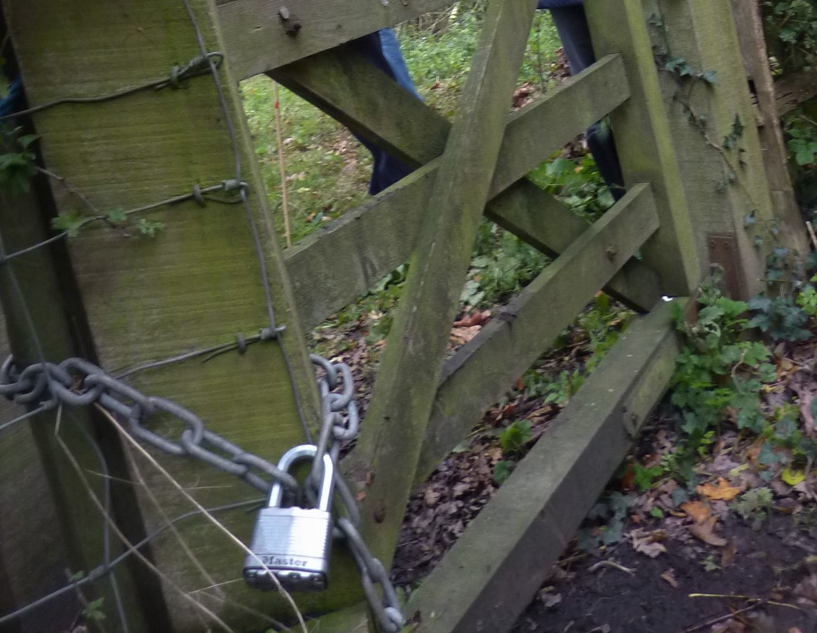 Public footpath adjacent to Horse Hill well site locked by landowner. 26 October 2019. Photo: DrillOrDrop Add a comment Cancel reply Δ