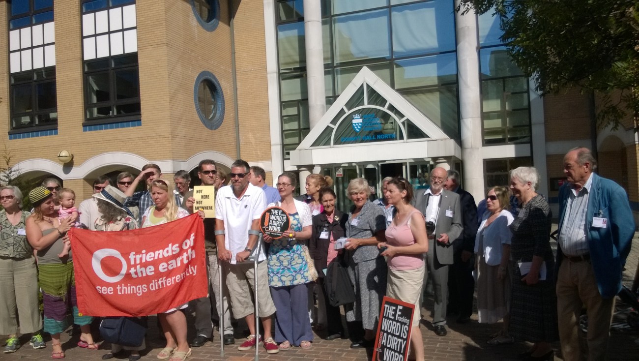 Campaigners against Celtique Energie’s drilling application between Wisborough Green and Kirdford gather before the planning committee meeting in Horsham this morning.