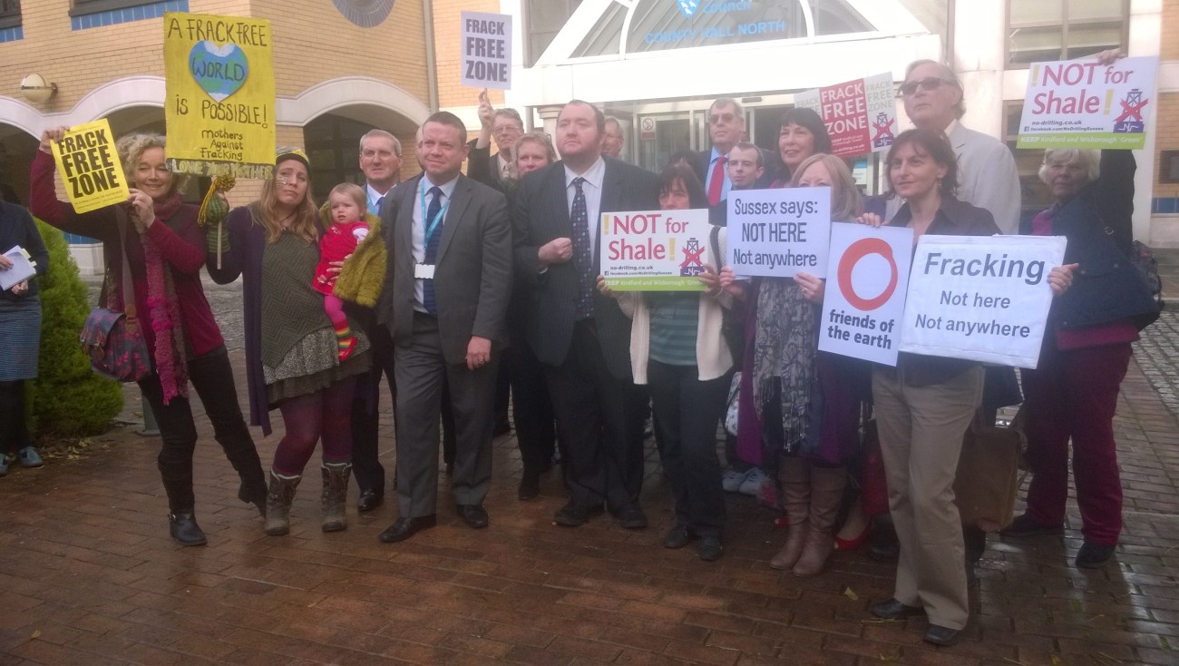 Labour county councillors pose with opponents of fracking before the discussion of a petition calling for West Sussex to be made a frack-free zone.