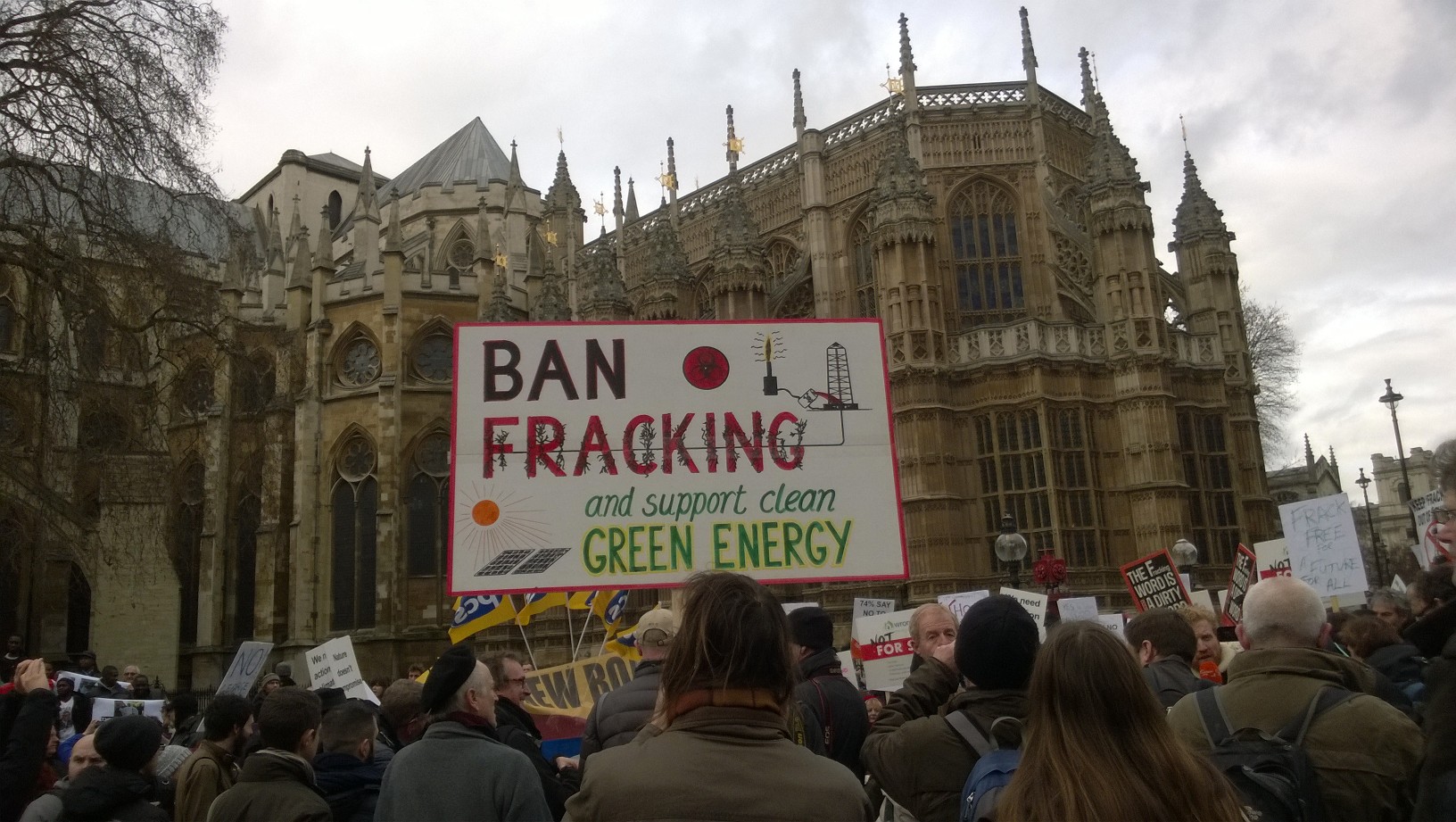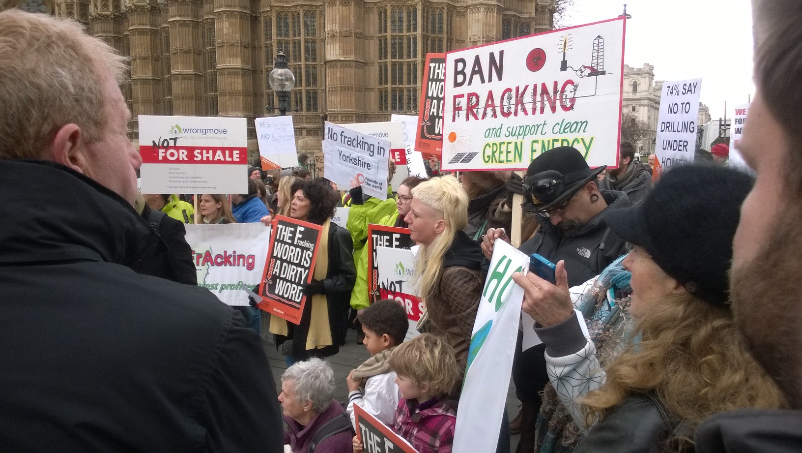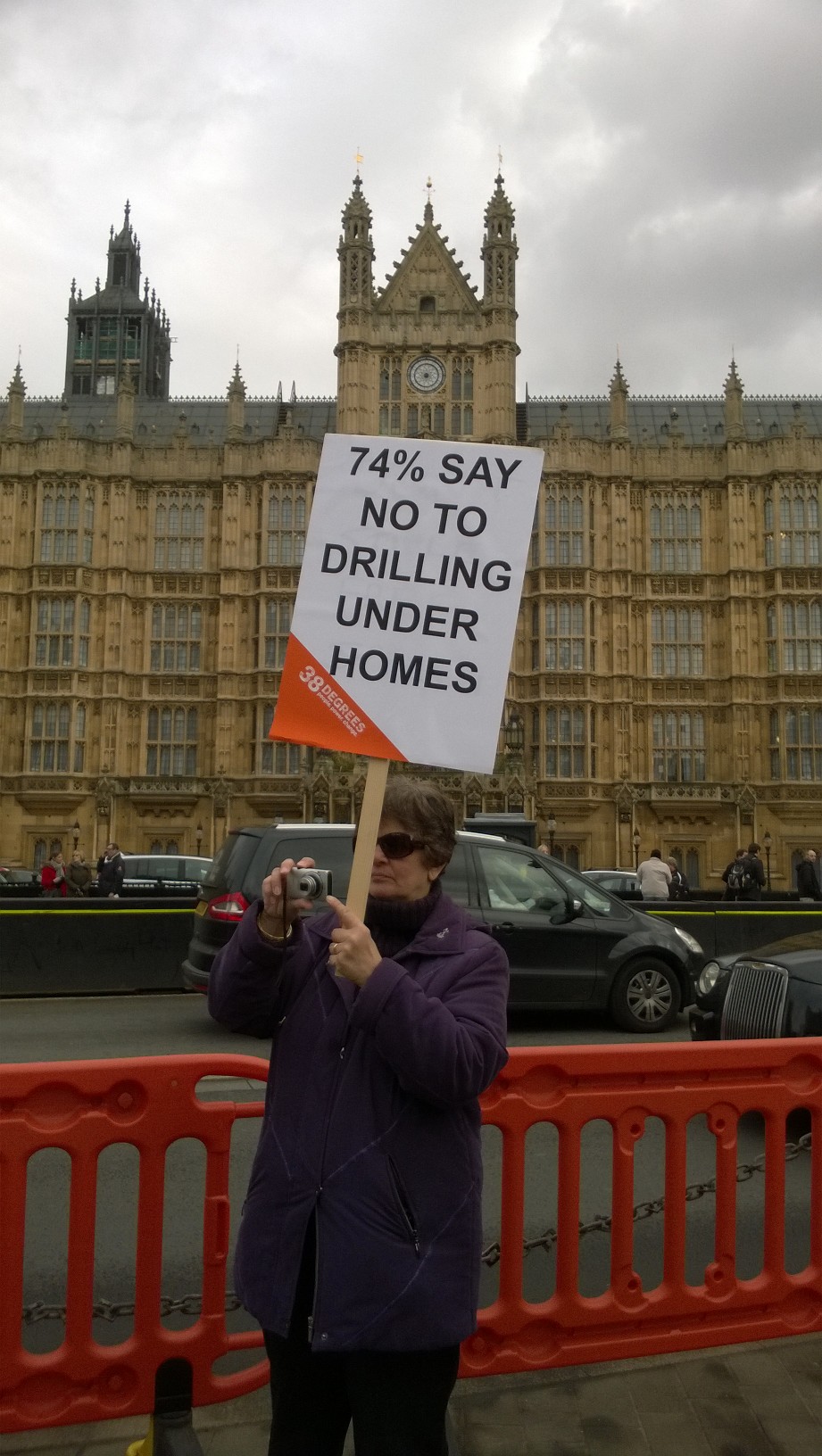 Images from the rally outside the Houses of Parliament at midday onwards today (26/1/15) calling for a moratorium on fracking. The rally coincided with the first ever votes by MPs on fracking. They were considering clauses about onshore oil and gas and hydraulic fracturing in the Infrastructure Bill. The rally heard from MPs, including Caroline Lucas and Norman Baker, the names behind an amendment calling for a moratorium, and campaigners including John Ashton and Bianca Jagger.