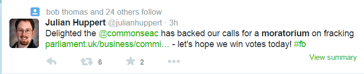 told the FT: “The call for a UK moratorium by senior cross-party MPs is a further blow to an industry still reeling from the recent ban on fracking in New York State due to health risks. The truth is people do not want a high-impact fossil fuel industry that would leave a legacy of pollution and disruption and would lock the world into further climate change.”