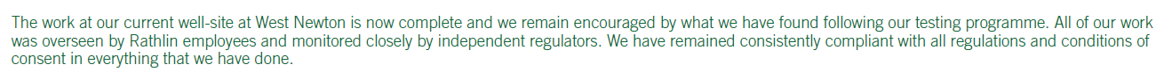 On 5th February this year, Rathlin Energy reported on its website that West Newton A “has now been suspended for the time being”. The website added: “We did not exercise our permitted option to undertake a mini fall-off test at West Newton A and we have no intention to. We may revisit the site where we still have permission to drill and test a second well”.