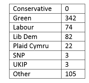 As for the interpretation of this piece I strongly question the unscientific nature of its approach. Of course all Green candidates disagree with fracking. The Green party is also fielding as many candidates as it can this election. It doesn’t matter if that was 200 or 10,000. I can make a political party against Cheese and with enough money field 1000 anti cheese candidates, but it means precisely nothing unless people vote for them. The Green party is predicted to perhaps hold its one seat. Therefore the most accurate interpretation of the above table – the most scientific – is Nick Grealy’s.