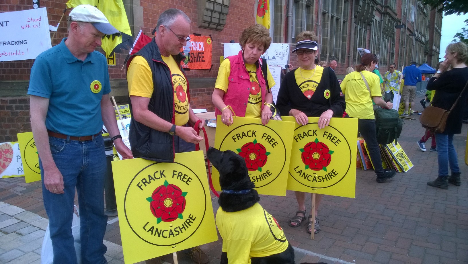 Anti-fracking campaigners display a giant open letter of support to councillors. The letter, by Frack Free Lancashire coalition of campaign groups, offers to meet the costs to the council of any appeal by Cuadrilla against refusal. Martin, of FFL,said: “They [the councillors] must have had a dreadful weekend. … The point of this card is to show that we support you but we are also putting our money where our mouths are. If it comes to a fist fight with Cuadrilla we will find your legal costs.”