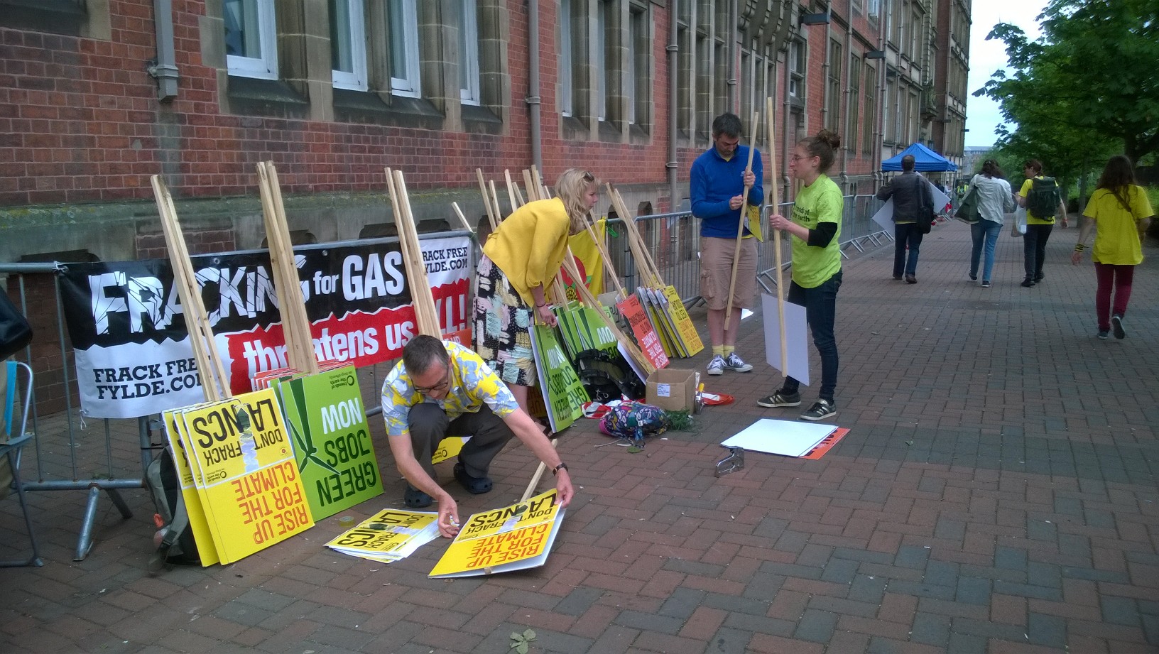Campaigners gather outside County Hall in Preston where the development control committee meets to decide Cuadrilla’s application to drill, frack and test up to four wells at Preston New Road, Little Plumpton.