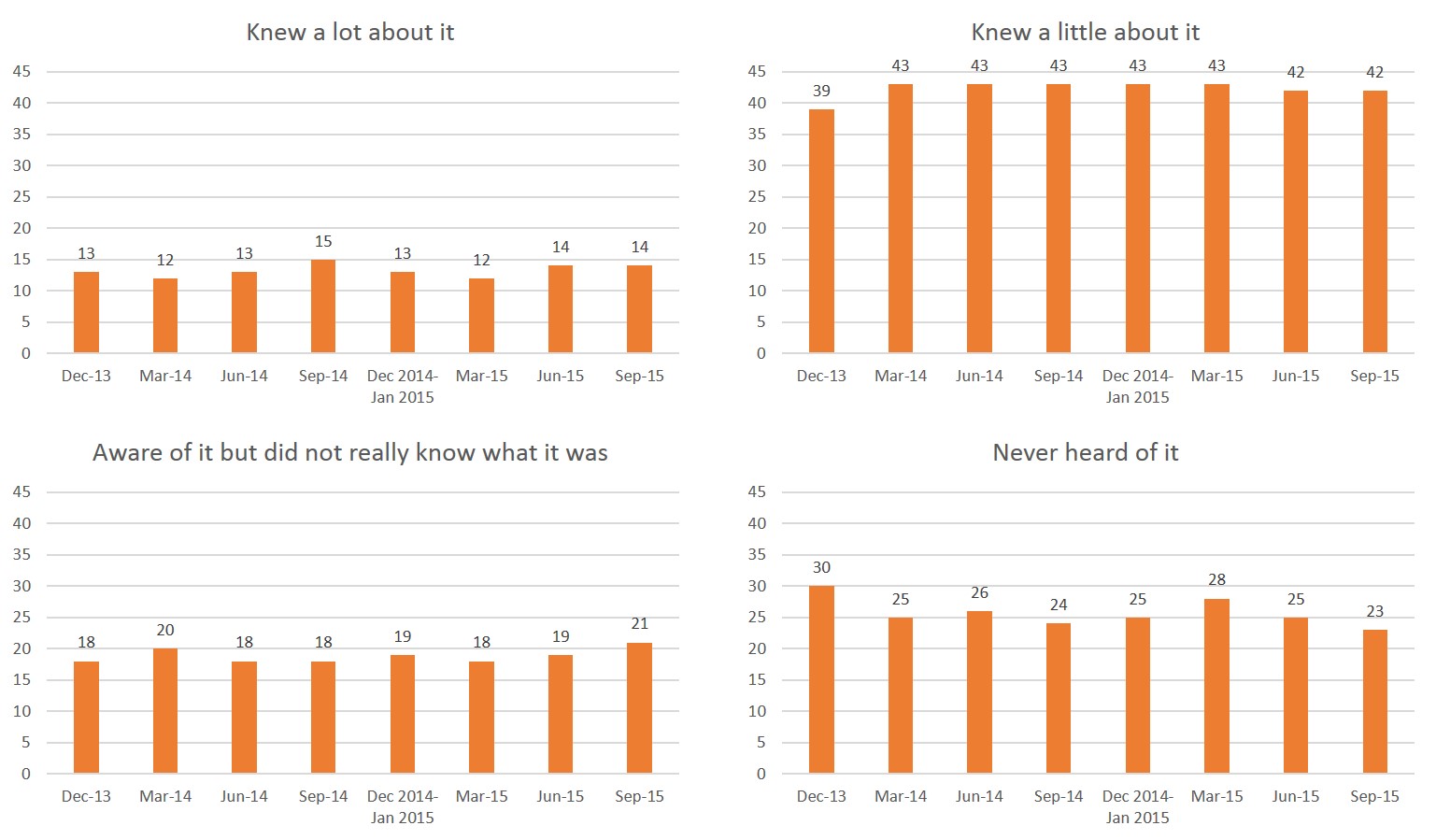 Awareness of shale gas exploitation has remained fairly stable over the past 18 months. In the latest survey, 56% said they knew a lot or a little about shale. This compares with 52% in December 2013. The proportion who said they had never heard of it has fallen from 30% in December 2013 to 23% in the most recent survey.