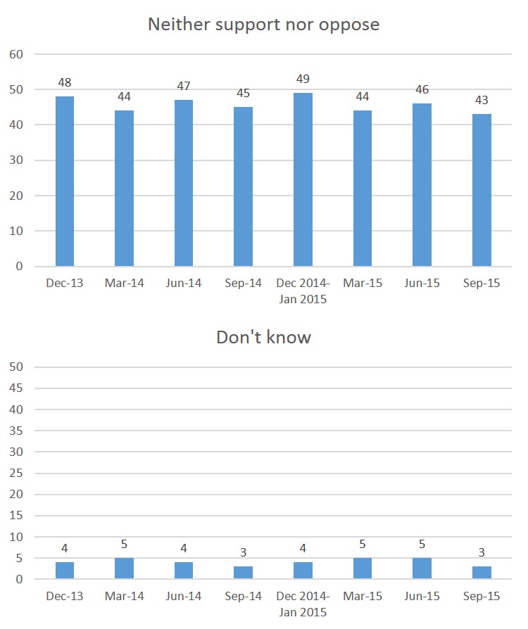 When the question was first asked in December 2013, support stood at 28% and opposition at 21%. The proportion of people who neither supported nor opposed was 48% and people who said they didn’t know was 4%.
