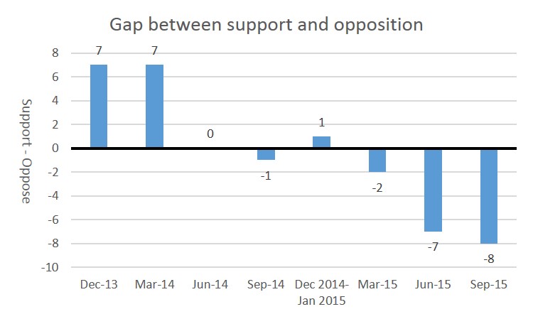 The gap between support and opposition is the largest recorded in the survey and the proportion of participants who are undecided is at its lowest level.
