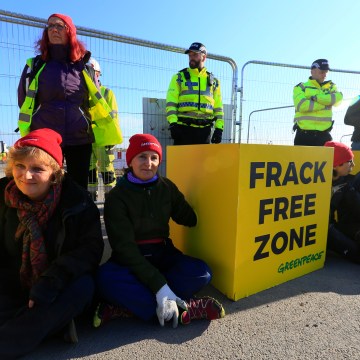 Volunteer campaigners, from areas facing fracking across the UK, block the entrance to the Preston New Road fracking site in Lancashire, England, with Greenpeace UK. The campaigners, from areas facing fracking, like Blackpool, Preston and Manchester have safely linked their arms inside reinforced yellow blocks, adorned with the Lancashire Rose, to create a “Frack Free Zone” blocking the entrance to the site. They intend to stop preparation works for the first UK frack for gas, after the government overruled the local council decision to reject planning permission