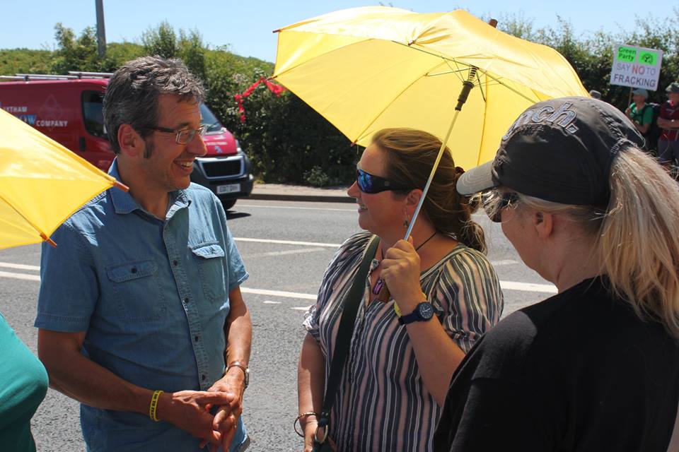 George Monbiot meets campaigners at Cuadrilla’s Preston New Road shale gas site, 25 June 2018. Photo: Refracktion