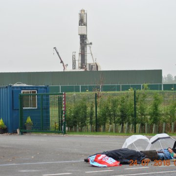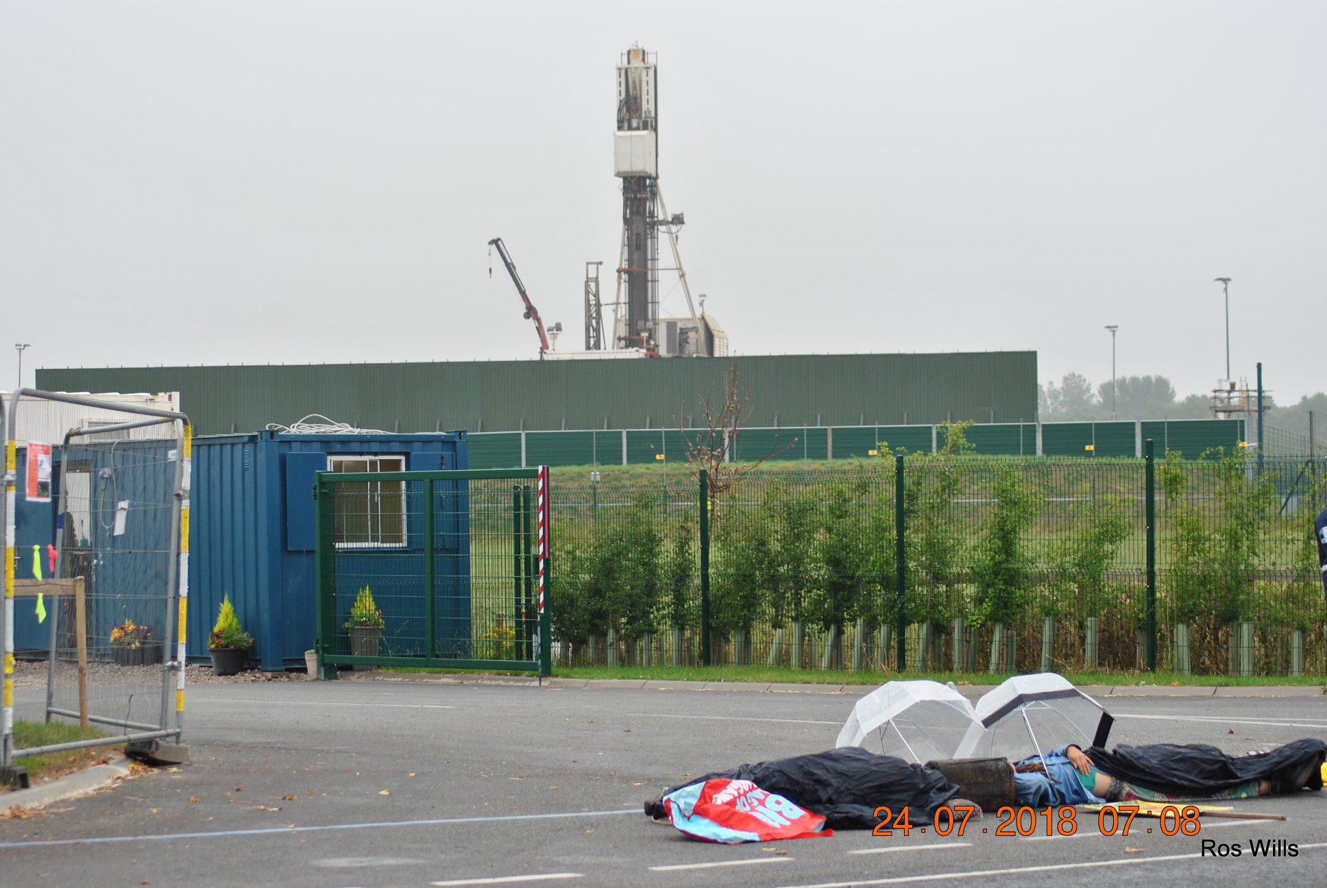 Lock-on protest outside Cuadrilla’s shale gas site at Preston New Road, 24 July 2018. Photo: Ros Wills
