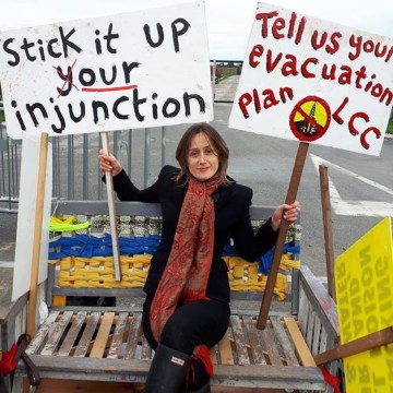 Campaigner and researcher, Helen Chuntso, outside Cuadrilla’s shale gas site at Preston New Road, 5 October 2018. Photo: Bob Dennett