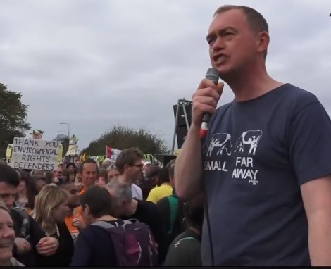 Tim Farron speaking at the National Climate Rally outside Cuadrilla’s shale gas site at Preston New Road, 20 October 2018. Photo: Still from