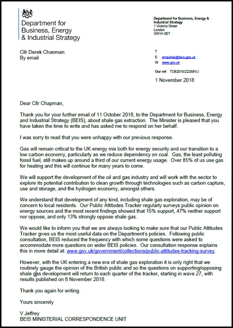 Published November 1, 2018 at 808 × 1135 in 15% support fracking and 31% oppose – government quarterly survey returns Letter from BEIS ministerial correspondence unit and Cllr Chapman. Personal details removed. ‹ Return to post Add a comment Cancel reply Δ