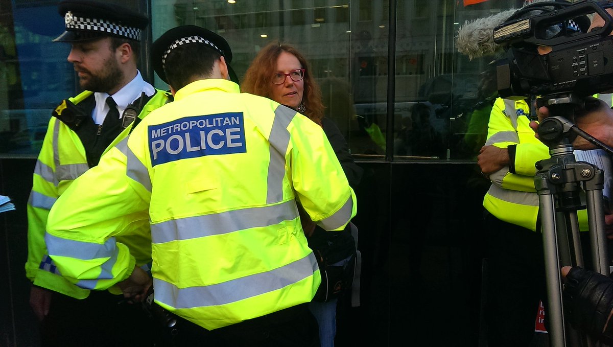 Ruth Jarman being arrested at climate change protest at the Department of Business, Energy and Industrial Strategy, 12 November 2018. Photo: Christian Climate Action
