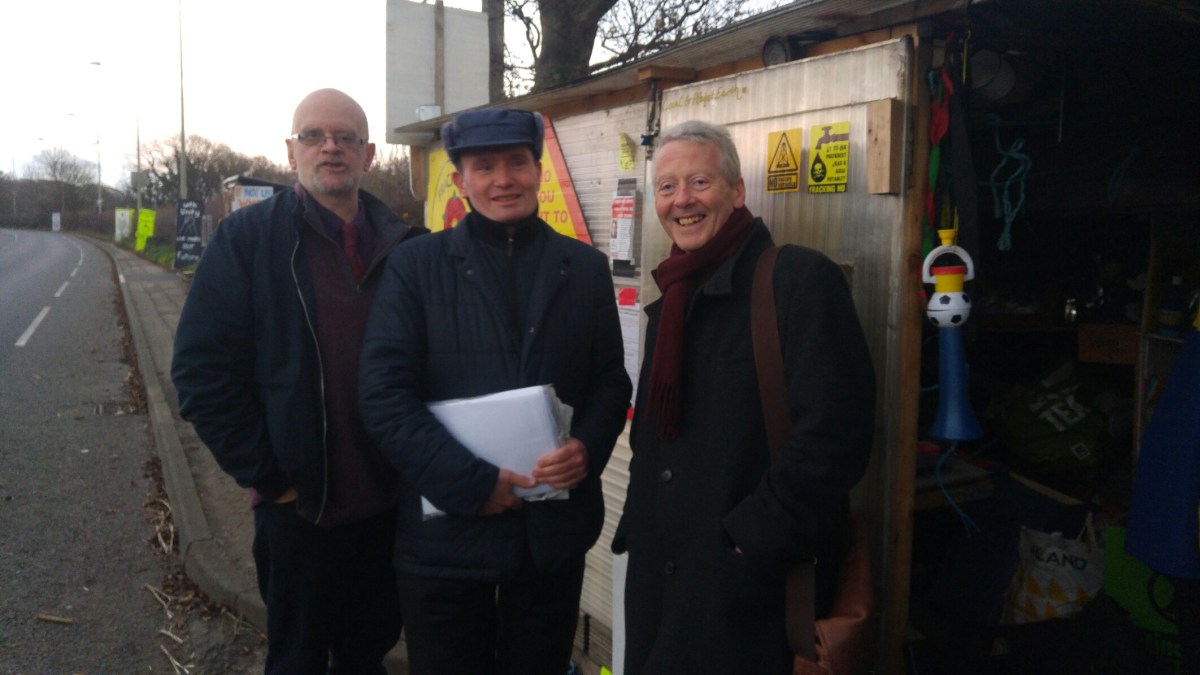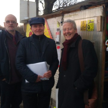 (l to r) Professor John Middleton, local physician Dr Frank Rugman and Professor Patrick Saunders visiting campaigners outside Cuadrilla’s shale gas site at Preston New Road, 19 November 2018. Photo: DrillOrDrop