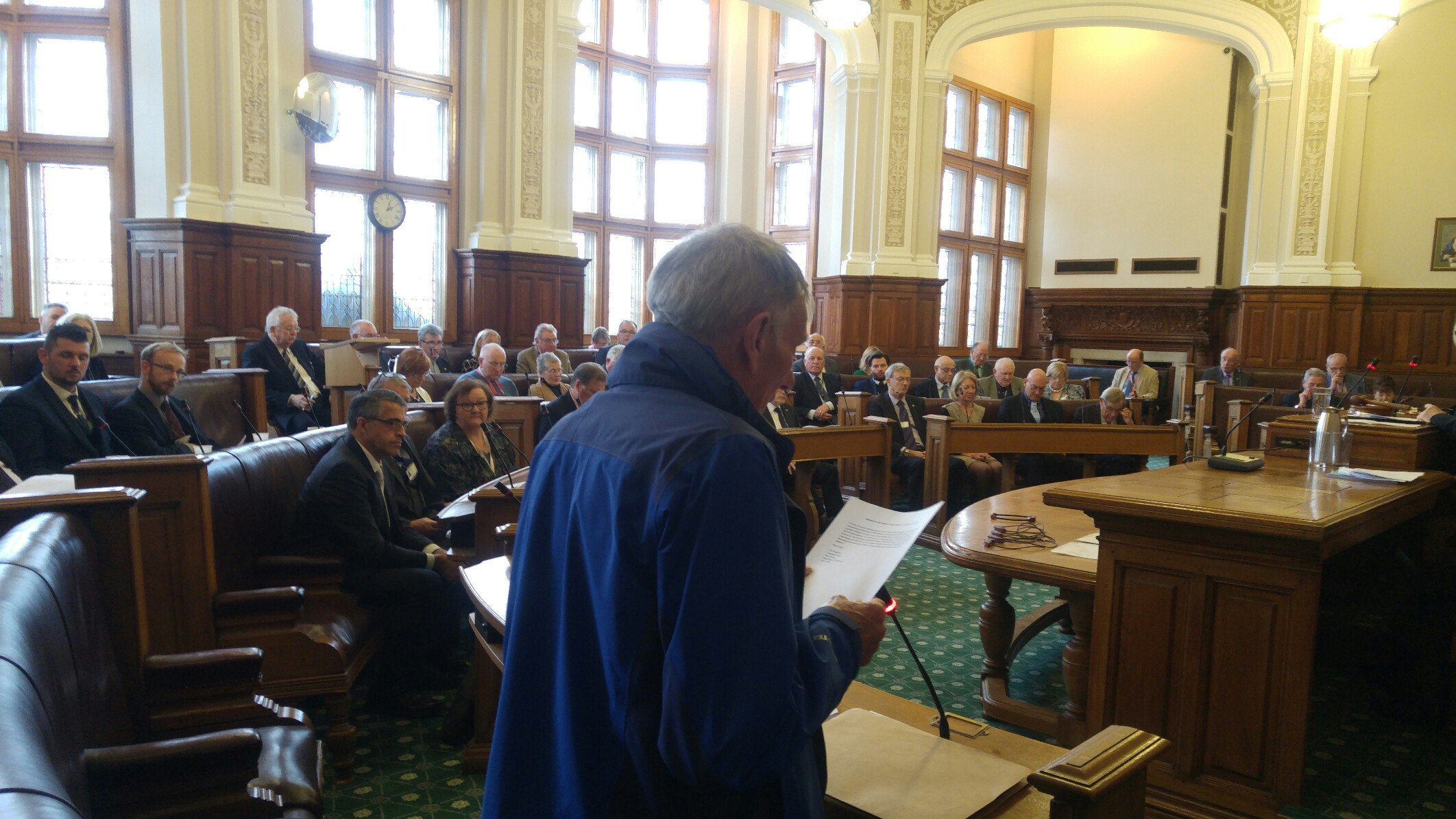 Harry Clark asking East Riding of Yorkshire Council to drop its eviction order for the West Newton monitoring station, 20 February 2019. Photo: DrillOrDrop