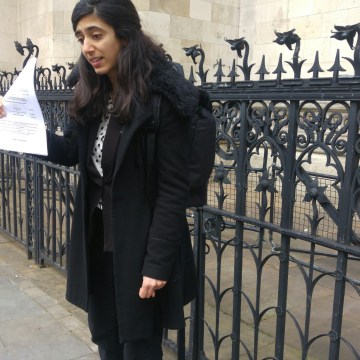 Katie de Kauwe, in-house lawyer at Friends of the Earth, outside the Royal Courts of Justice after the ruling against the Ineos injunction, 3 April 2019. Photo: DrillOrDrop