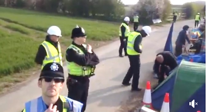 Published April 16, 2019 at 671 × 366 in Third eviction of drill site protest camp Eviction of road-side camp outside Rathlin Energy’s West Newton-A exploration site, 16 April 2019. Photo: from livestream video ‹ Return to post Add a comment Cancel reply Δ