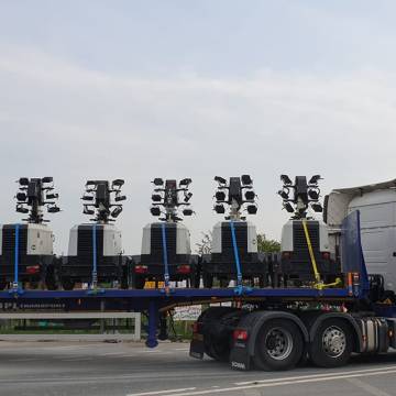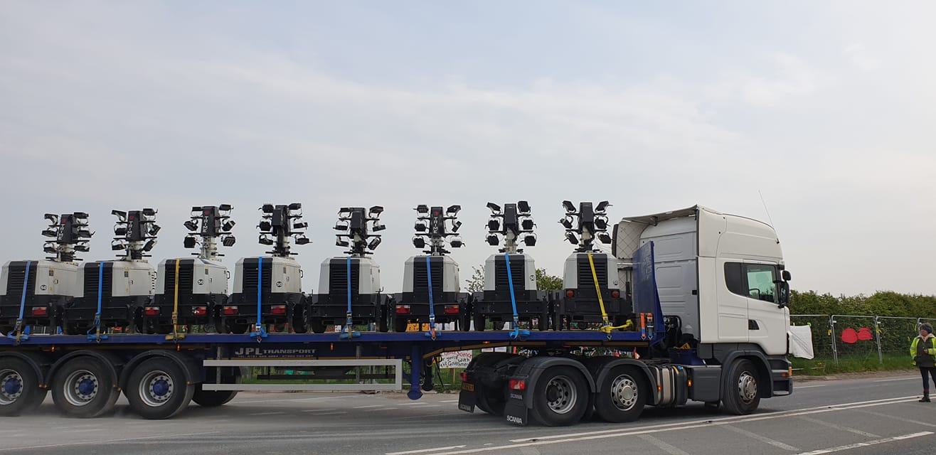 Lighting gear leaving Cuadrilla’s Preston New Road shale gas site, near Blackpool, 24 April 2019. Photo: Jo Lucylou