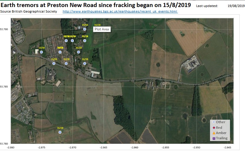 Published August 19, 2019 at 833 × 516 in PNR tremor tracker 2019 Location of seismic events induced by fracking at Cuadrilla’s Preston New Road site near Blackpool. 15-19 August 2019. ‹ Return to post Add a comment Cancel reply Δ