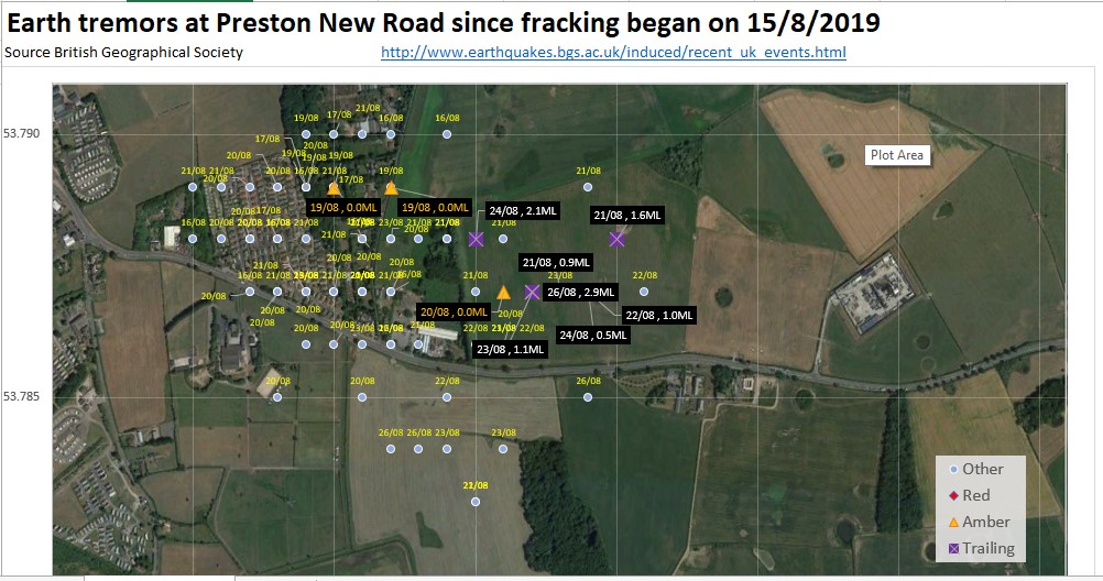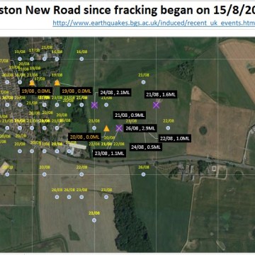 Seismic events induced by fracking at Cuadrilla’s Preston New Road shale gas site since 15 August 2019. Map by DrillOrDrop using BGS data