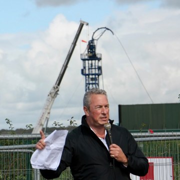 Businessman Mark Mills speaking outside Cuadrilla’s fracking site at Preston New Road near Blackpool. on 31 August 2019. Photo: Refracktion