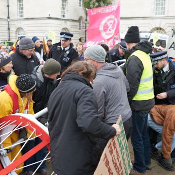 Police remove a lighthouse structure at a climate protest outside Surrey County Council, 10 December 2019. Photo: Extinction Rebellion