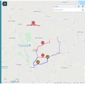 Road closures (marked in red) and diversion (purple) around Rathlin Energy’s new well site at West Newton B near Burton Constable. The other section marked in red is for the company’s other local well site at West Newton A