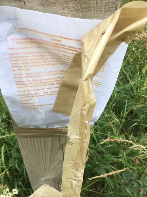 Notice of Egdon’s Resources’ application for an extension of planning permission at North Kelsey, Lincolnshire, 2 July 2020. Photo: Used with the owner’s consent