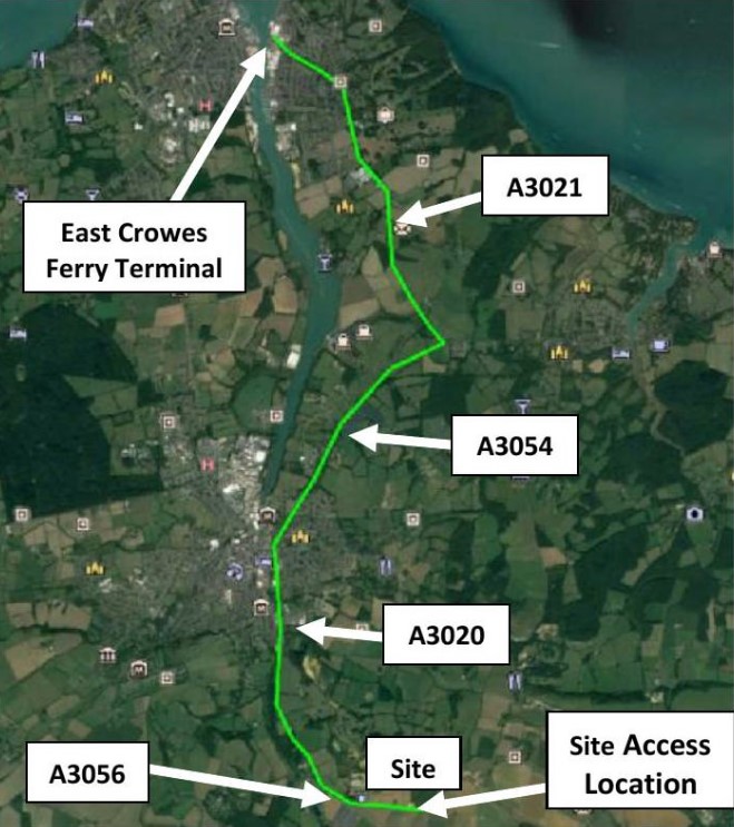 The documents identified how incoming HGVs would reach the site from the East Cowes ferry terminal. The route would follow: Dover Road (A3021), Well Road (A3021), York Avenue (A3021), Whippingham Road (A3021), Racecourse (A3054), North Fairlee Road (A3054), Fairlee Road (A3054), Coppins Bridge (A3020), St George’s Way (A3020), Blackwater Road (A3020), A3056 to the site access.