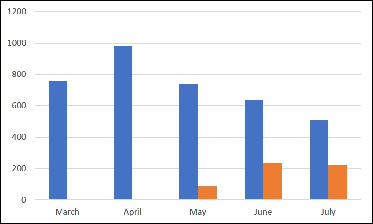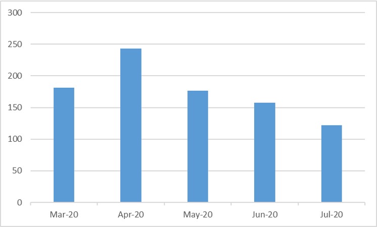 The weight of oil in July 2020 was 508 tonnes, down 26% on the total for June (637 tonnes). The weight was 737 tonnes in May 2020 and 981 tonnes in April 2020.