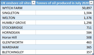 Oil production (tonnes) from top 10 UK onshore oil sites in July 2020. Source: OGA