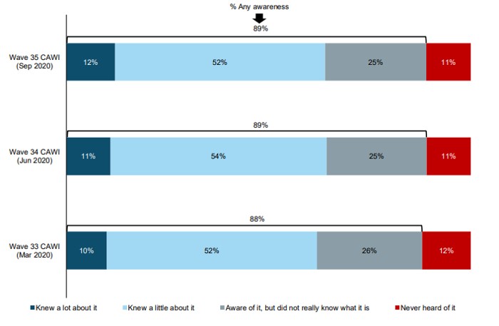 The survey found that 89% of participants were aware of fracking for shale gas. This was unchanged on the result in June 2020.