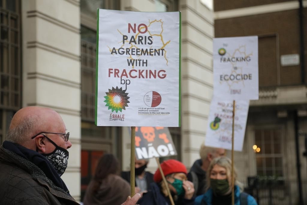Opponents of fracking held a demonstration outside BP’s headquarters in London as part of an international day of action.