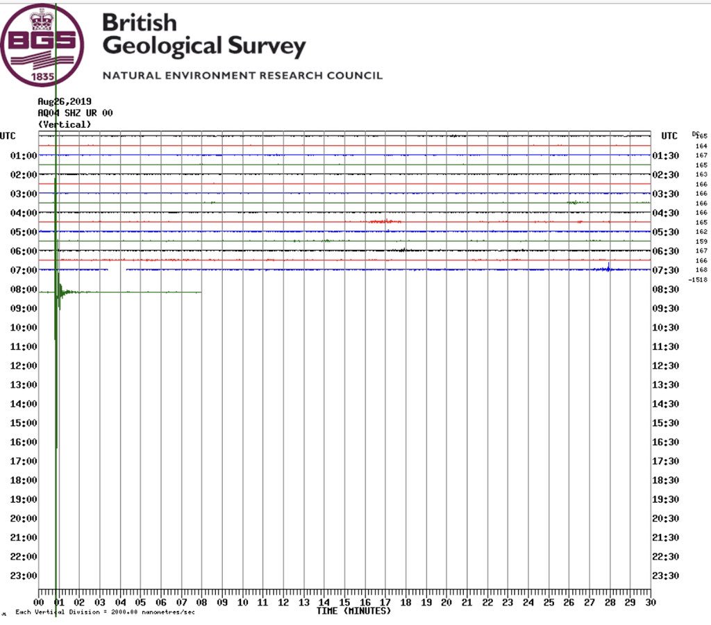 Chart showing a 2.9ML earthquake induced by fracking at Cuadrilla’s Preston New Road site on 26 August 2019
