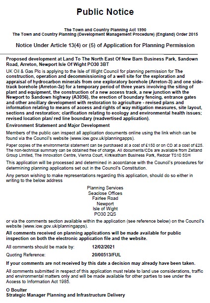 Island Roads, the organisation which manages local highways, had previously recommended that a planning application by UK Oil & Gas plc (UKOG) at Arreton be refused.