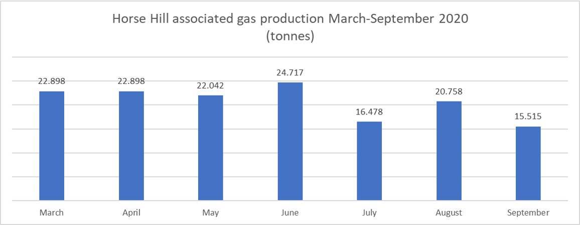 Production of waste gas at Horse Hill also fell in September to 15.5 tonnes, down from 20.75 in August. The ratio of gas to oil was down slightly. Gas at Horse Hill is currently flared.