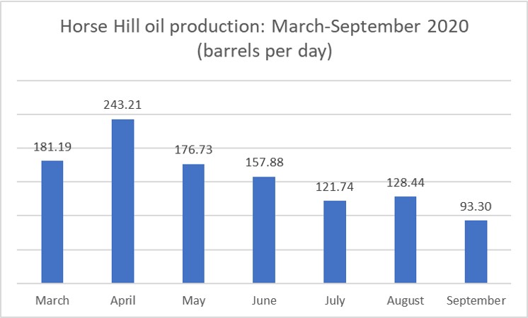 The figures for September 2020, the most recent available, report that Horse Hill produced 376 tonnes of oil, or 93.30 barrels of oil per day (bopd).