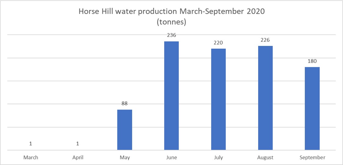 The total amount of formation water produced at Horse Hill fell in September from 226 tonnes in August to 180 tonnes in September. But the ratio of oil to water was 2.1, down from 2.4 in August.