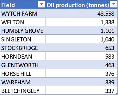 The biggest producing field, Wytch Farm, in Dorset, which supplies 84% of UK onshore oil, fell 4% in September to 48,558 tonnes. But production at other fields at Welton, Stockbridge, Humbly Grove, Horndean and Glentworth all increased in September.