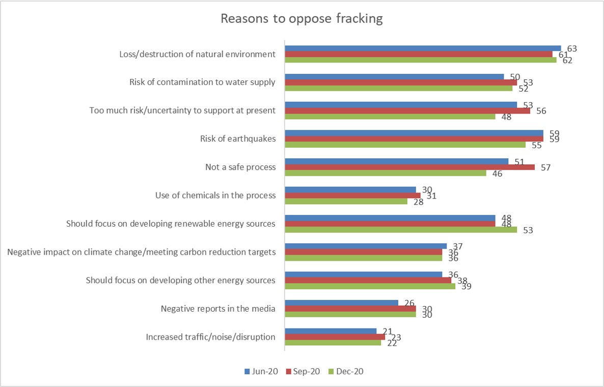 On reasons to oppose fracking, loss or destruction of the natural environment remained the largest, at 62%, followed by risk of earthquakes at 55%.