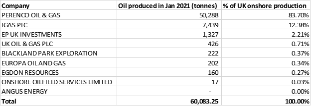 Perenco extracted 84% of UK onshore oil in January 2021, a level that has been near stable for the past year.