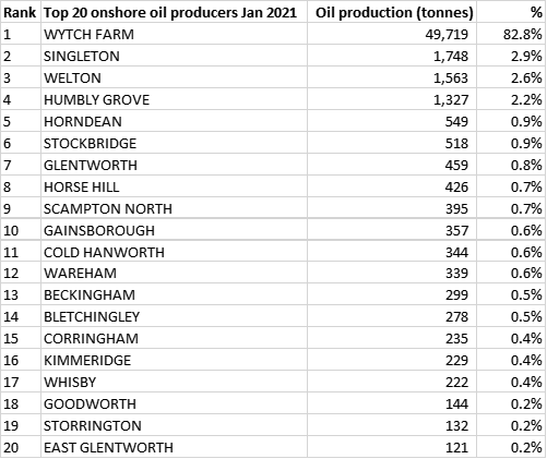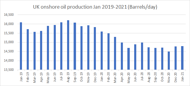 Wytch Farm (Dorset): January 2021 was down slightly (0.15%) on December 2020 but up on November 2020.