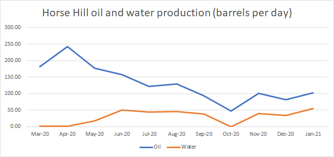 The Horse Hill field, where an autumn workover aimed to solve a water problem, saw the water cut rise from 28% in November 2020, to 30% in December 2020 and 35% in January 2021.