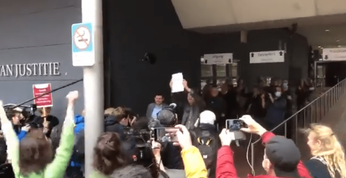 Campaigners celebrate outside the Hague District Court after the ruling against Royal Dutch Shell, 26 May 2021. Photo: still from video by Friends of the Earth Netherlands