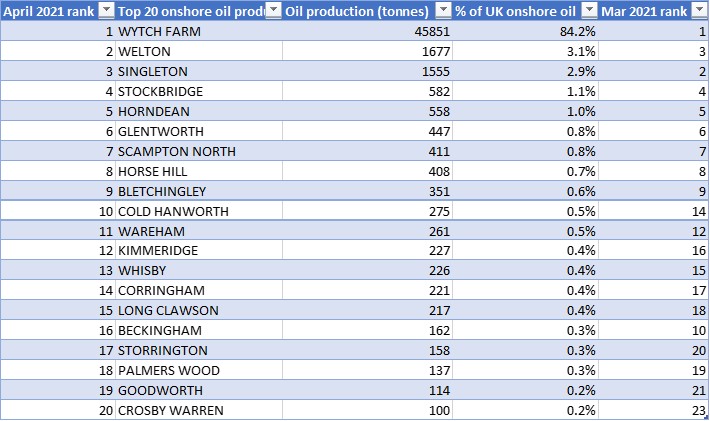 - Total UK onshore production in April 2021 was 8% down compared to April 2020 and 11% down compared to April 2019.