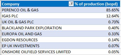 - EP UK Investments saw its share of onshore oil production fall from 0.5% to 0.07% as output from their Humbly Grove field continued to decline.