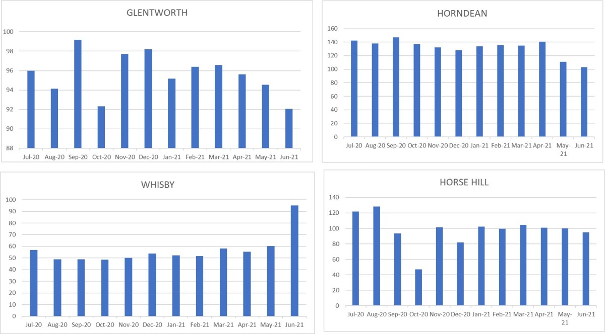Horndean, Hampshire: Production in June 2021 was 73% that of April 2021.