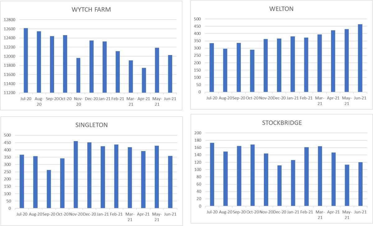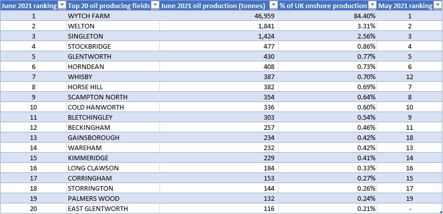 The ranking of the top four fields (Wytch Farm, Welton, Singleton and Stockbridge) has remained unchanged since April 2021.